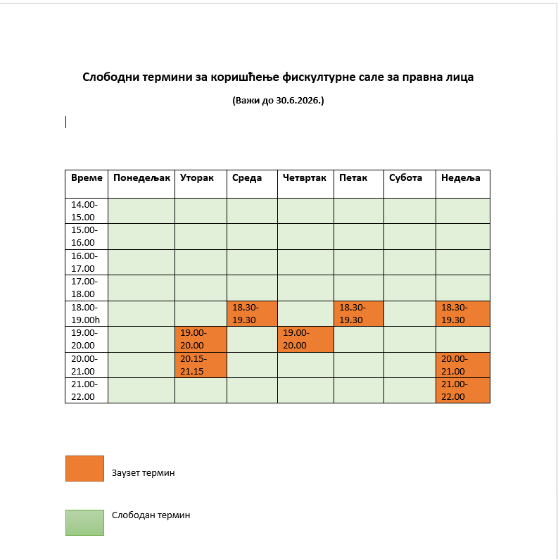 Slobodni termini za korišćenje fiskulturne sale za pravna lica